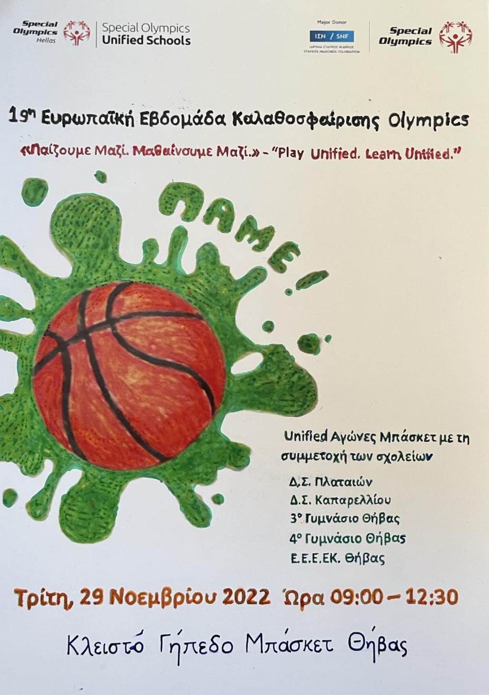 Το σχολείο μας συμμετείχε στην 19η Ευρωπαϊκή Εβδομάδα Καλαθοσφαίρισης Special Olympics. Οι αγώνες πραγματοποιήθηκαν στο κλειστό γήπεδο Μπάσκετ Θήβας την Τρίτη 29 Νοεμβρίου 2022 με τη συμμετοχή του Ε.Ε.Ε.ΕΚ Θήβας, του Δ.Σ Πλαταιών, του Δ.Σ Καπαρελλίου και του 4ου Γυμνασίου Θήβας,