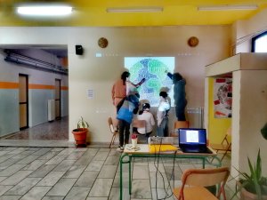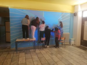 Παράλληλα στην εργασία μας συμμετείχε εθελοντική ομάδα μαθητριών του συστεγαζόμενου Λυκείου απεικονίζοντας επίσης επιτοίχια σύμβολα που νοηματοδοτούν την ΕΝΟΤΗΤΑ και την ΟΜΟΨΥΧΙΑ. Στο χώρο επίσης παρουσιάστηκαν εικαστικές δημιουργίες με θέμα "Πως φαντάζομαι το μέλλον της Ανθρωπότητας" από μαθητές και μαθήτριες όλων των τάξεων του Γυμνασίου. Στις ομαδικές εργασίες συμμετείχαν οι μαθητές και οι μαθήτριες: