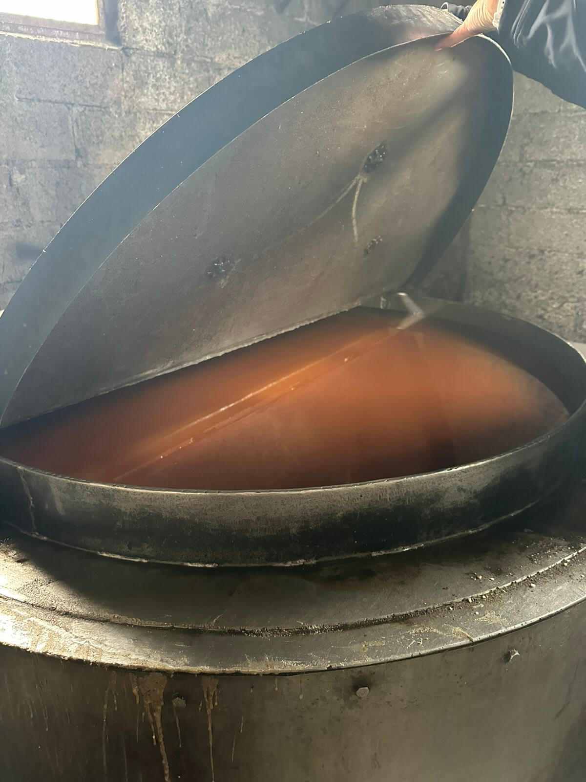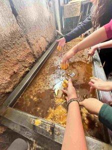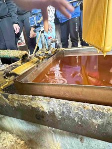 Στη συνέχεια, οι μαθητές είχαν την ευκαιρία να δουν από κοντά πως ξεκινά η παραγωγή των κεριών, απευθείας από το καζάνι. Το μείγμα παραφίνης, που αποτελείται από παραφίνη υψηλής καθαρότητας και παραφινικά υπολείμματα (απόκερα), θερμαίνεται σε περίπου 91°C μέχρι να μετατραπεί σε υγρή, ομοιογενή μάζα. Κατά τη θέρμανση, τα φυτίλια και άλλες ακαθαρσίες, λόγω διαφοράς πυκνότητας, κατακάθονται στον πάτο του καζανιού και αφαιρούνται προσεκτικά με ειδική τσουγκράνα.